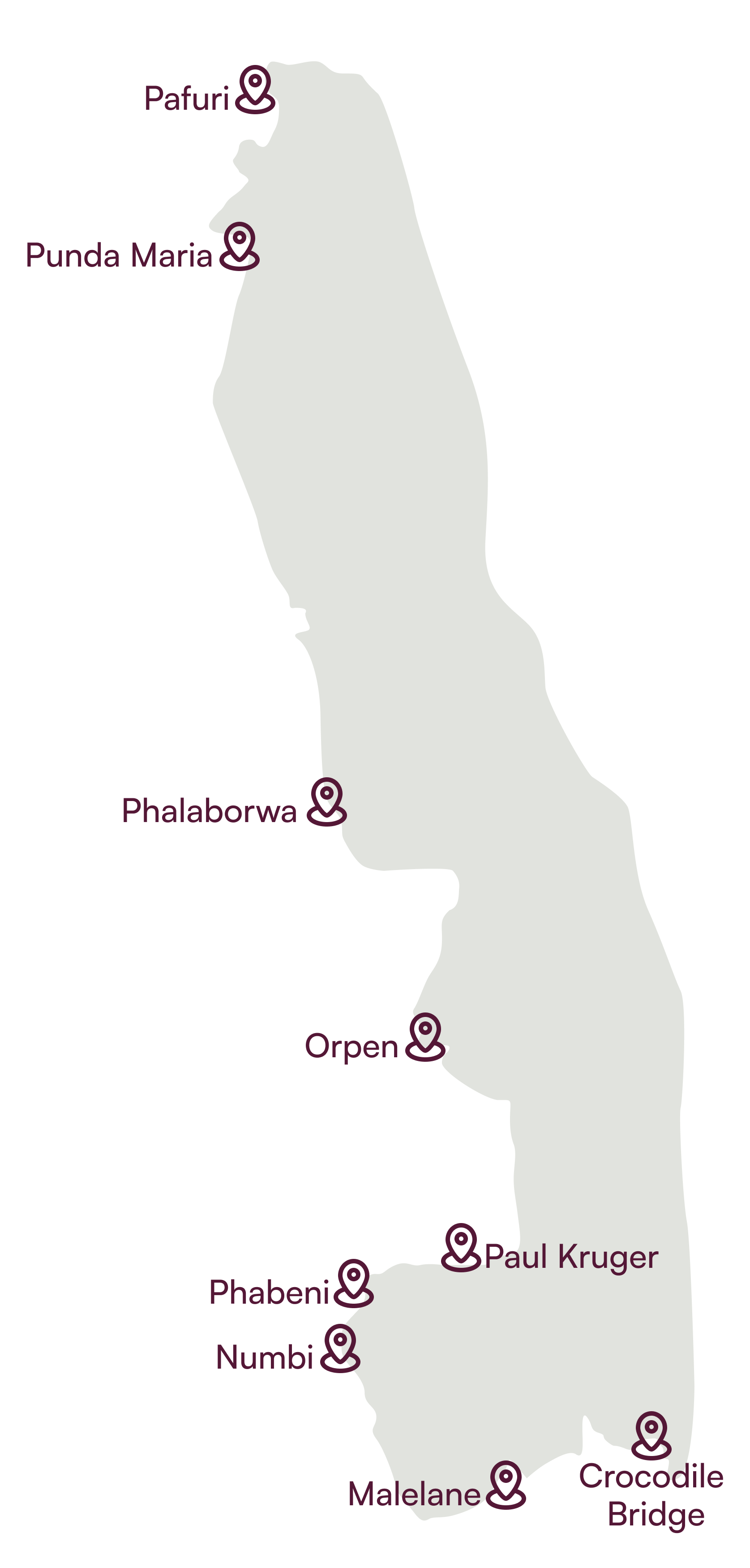 Located in the Limpopo and Mpumalanga provinces of South Africa, Kruger National Park stretches 352 kilometres, from north to south, along the Mozambique border. The environment is generally flat with a few hills and includes areas of open veld and dense bush. As you arrive, you find yourself surrounded by various trees like the baobab, fever tree, knob thorn, marula, and mopane trees. The Kruger Private Game Reserves of the Greater Kruger area neighbour the national park with an unfenced western boundary that extends the ecosystem and allows the animals to wander freely.