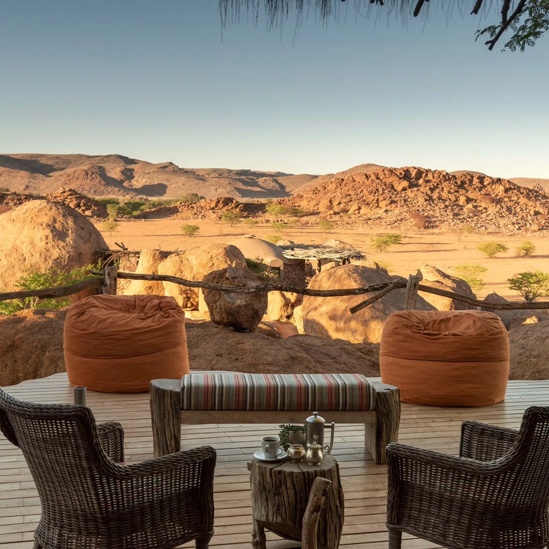 Camp Kipwe is an intimate and remote bush lodge located in Namibia's arid yet starkly beautiful Twyfelfontein region, home to many ancient Bushman etchings. The 9 specially-designed rooms are unique and private, with outdoor bathrooms, thatched roofs and spectacular views over the surrounding area. Camp Kipwe offers guided nature walks around the Twyfelfontein Conservancy, as well as trips to see the Bushman etchings, the mysterious Organ Pipes and Burnt Mountain. For an extraordinary experience, an Elephant Nature Drive is a must-do; explore the terrain in search of these elusive desert-dwelling elephants who have adapted to the dry and sandy conditions of northern Namibia.