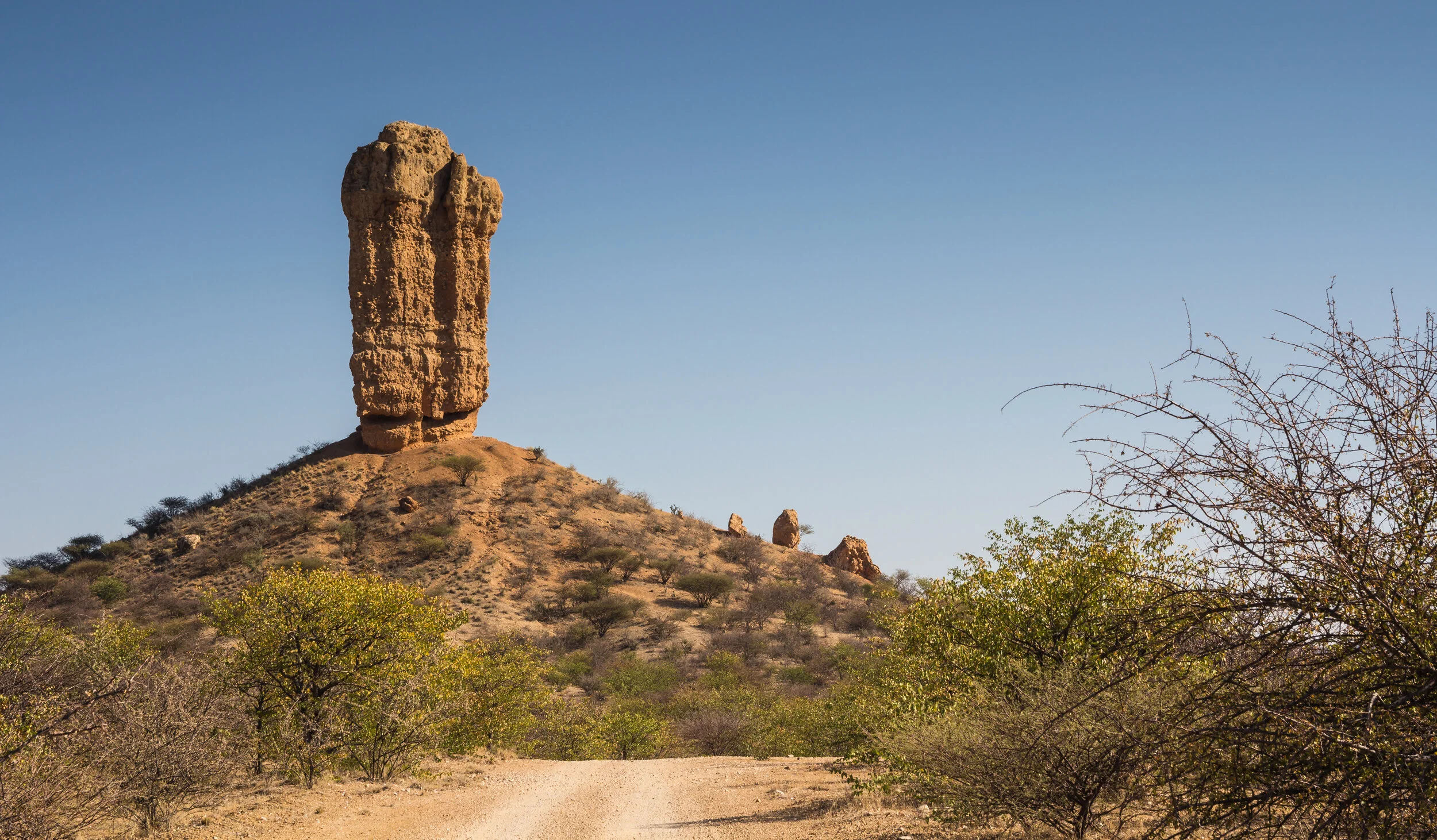 Leaving the petrified forest behind, we reached the town of Khorixas after 46 km, where we refuelled and restocked before continuing on the C39 inland until Outjo. We opted to take a short detour to see the peculiar “Vingerklip” (Finger rock), the turnoff for which was about 52 km east on the C39. A further 20 km stretch brought us right up to rock where we took a stroll along the marked path.
